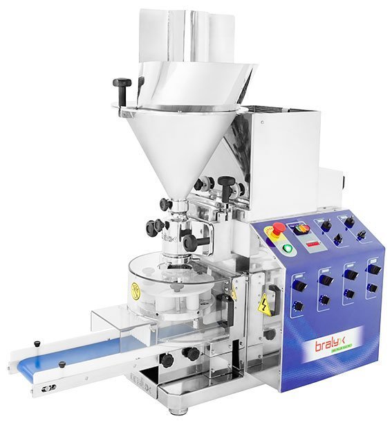 Na máquina de salgados grandes da Bralyx, você ajusta com precisão a quantidade de massa e recheio.