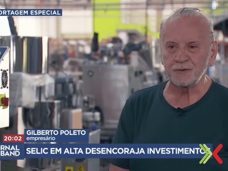 Durante a reportagem, Gilberto Poleto, fundador da Bralyx, participa do editorial relatando a realidade enfrentada por empresas industriais diante do cenário de juros elevados. Ele destaca o receio de contrair dívidas e não conseguir honrar os compromissos financeiros, mesmo em negócios saudáveis e com demanda existente.